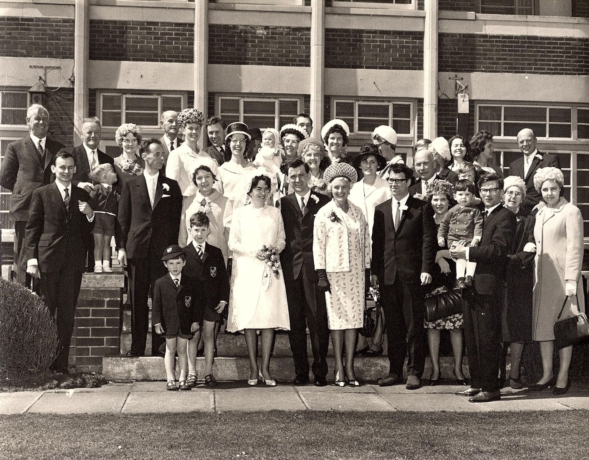 The wedding party is back row: Uncle Jimmy Simmons and Uncle Jimmy Naysmith, Carol, Alan , Muriel, Auntie Patty with grand daughter, Helen, Auntie Muriel, Auntie Jean with David behind, Pam, Dad, Dorothy's best school friend, Angela, Doreen, daughter of Peggy, then Uncle John Cheyne.